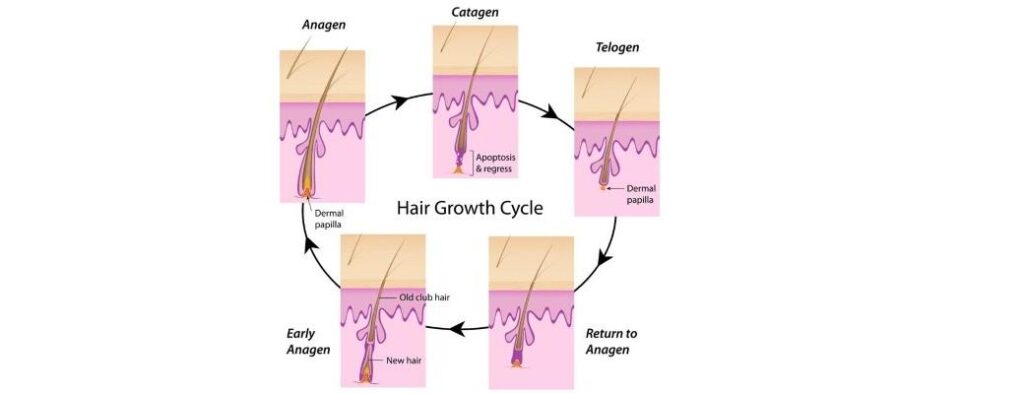 - Telogenphase (Ruhephase) – das Haar fällt aus, der Follikel ruht.